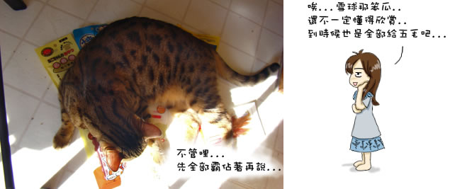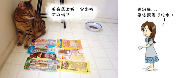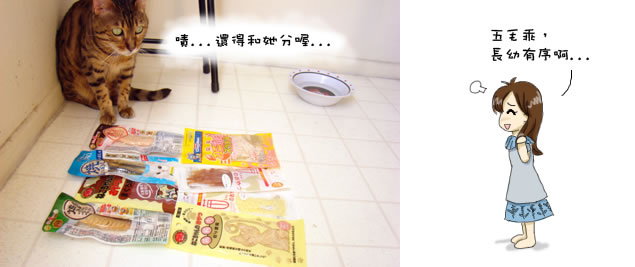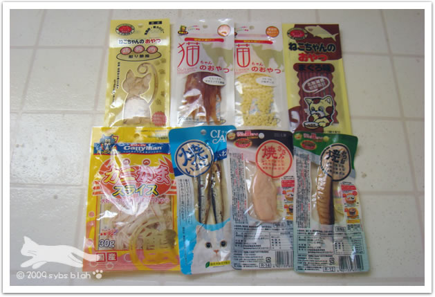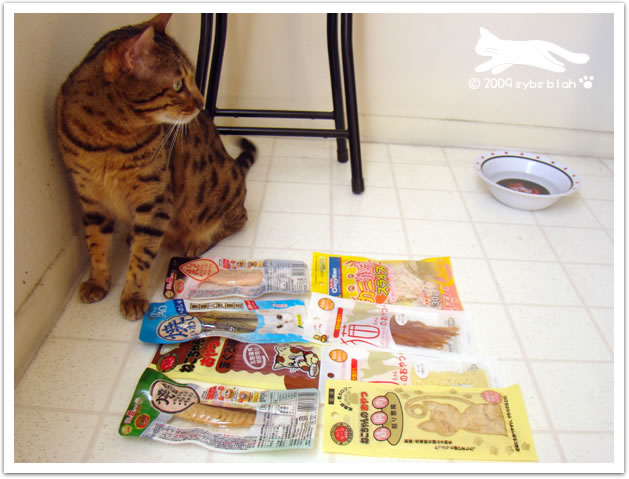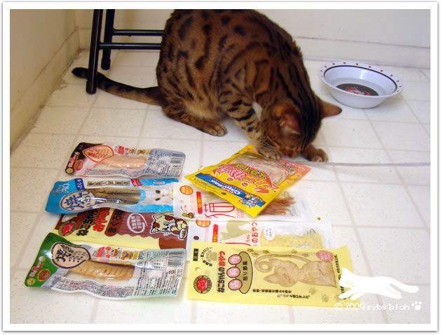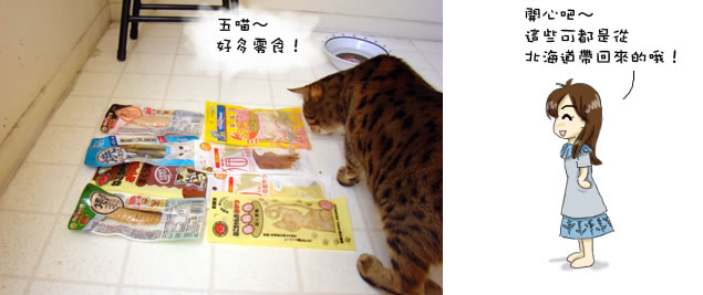 這些就是在狸小路的那間ドン・キホーテ買的 日本商品的包裝真是沒話說,連貓零食都做得很可愛,讓我幾乎想全掃回家,不過還是很節制的在有限的時間內快速選了幾包。 兩隻貓對這些零食的反應如何呢?下篇揭曉 花絮blah:這次為了讓五毛配合拍照,有用到釣貓桿來兜她以達到效果